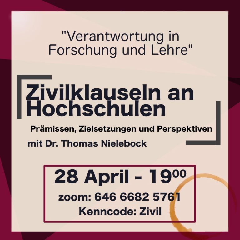 Online-Gastvortrag von Dr. Thomas Nielebock am 28.04.21 um 19:00: „Zivilklauseln an Hochschulen – Prämissen, Zielsetzungen und Perspektiven“